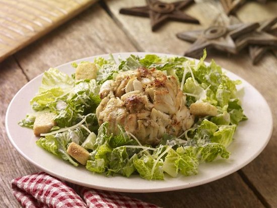 bed of romaine lettuce adorned with baby spinach and delicious half 1/2 lb. real lump crab lightly seasoned with old bay and a special blend of herbs, caesar dressing, croutons and topped with parmesan cheese