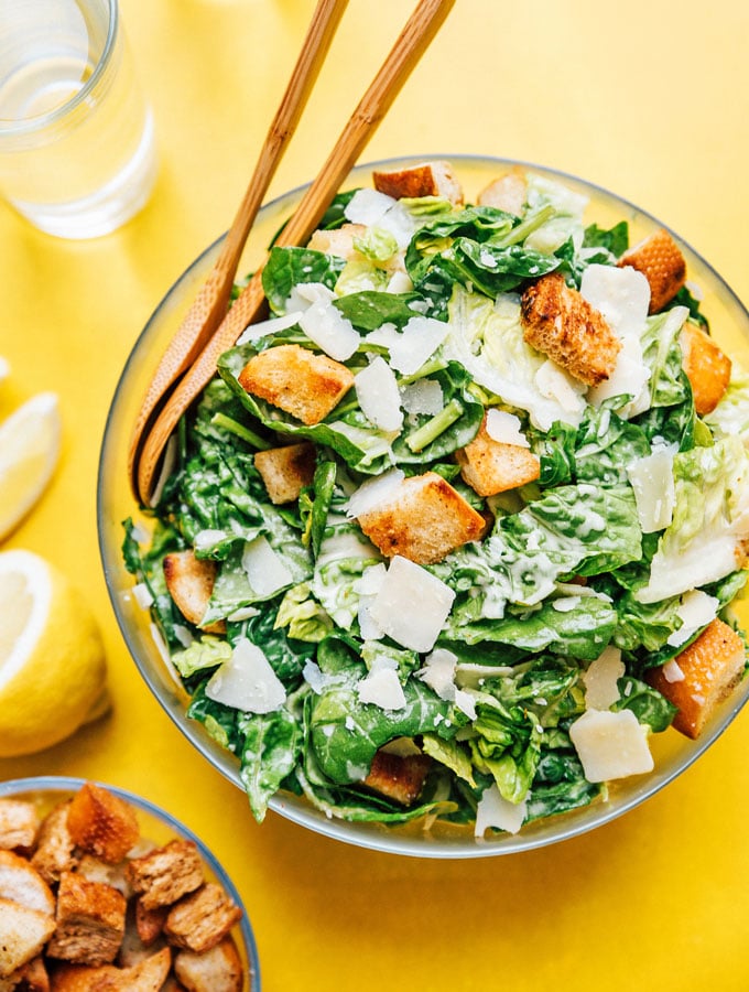 bed of romaine lettuce adorned with baby spinach and delicious, caesar dressing, croutons and topped with parmesan cheese
